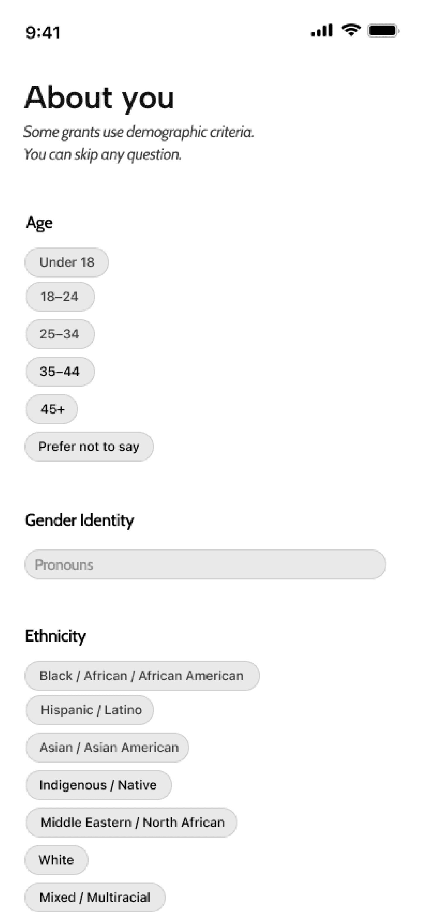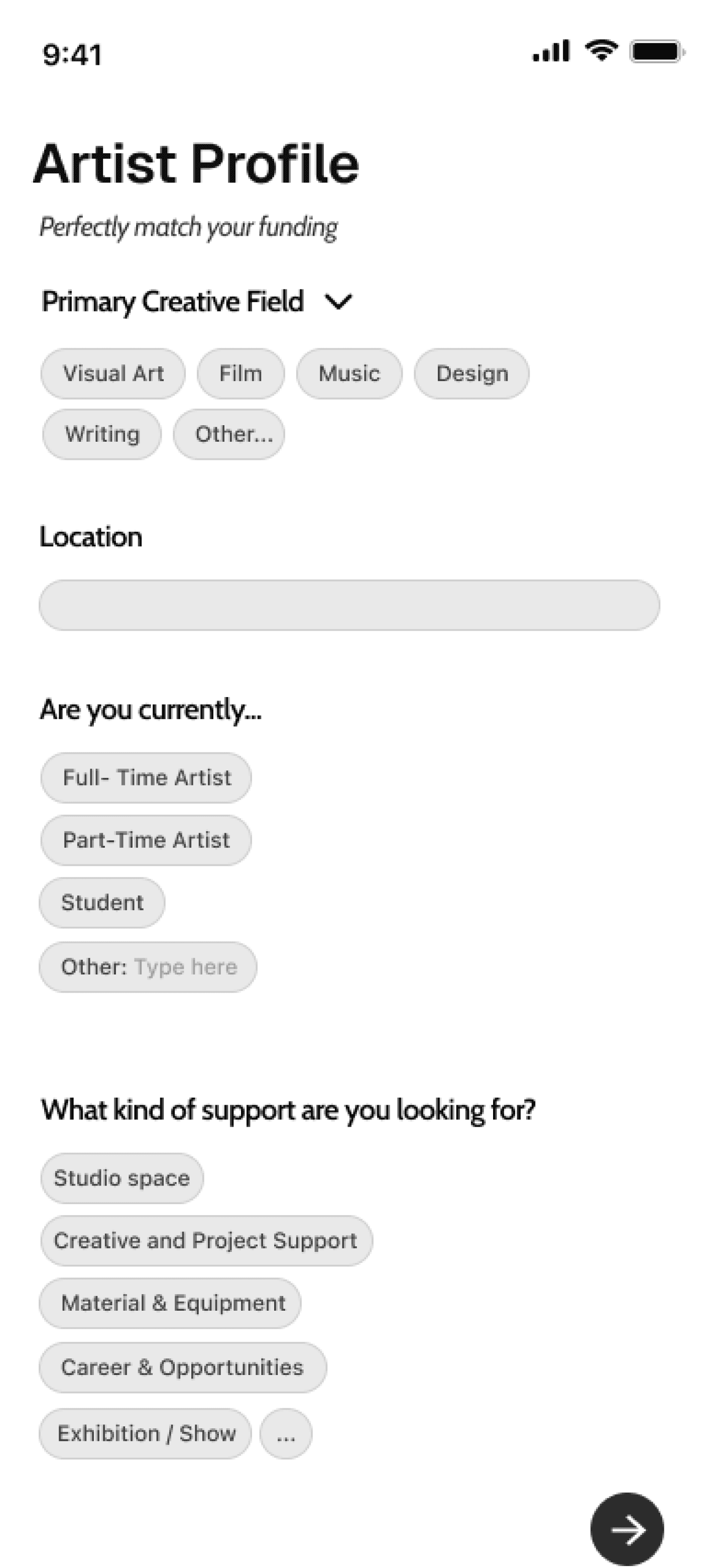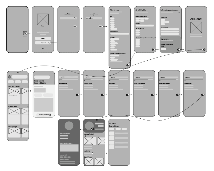 The user flow begins with onboarding and a quick needs quiz from basic profile info to specifically artist profile for complete personalization. Based on the results, the app matches users to relevant grants that they are likely looking for.