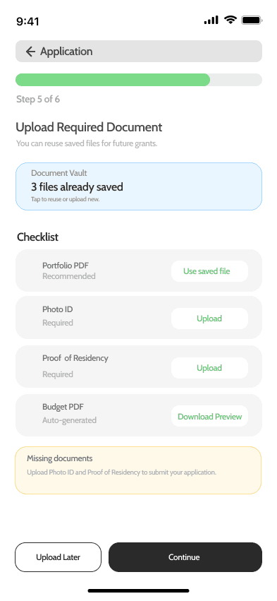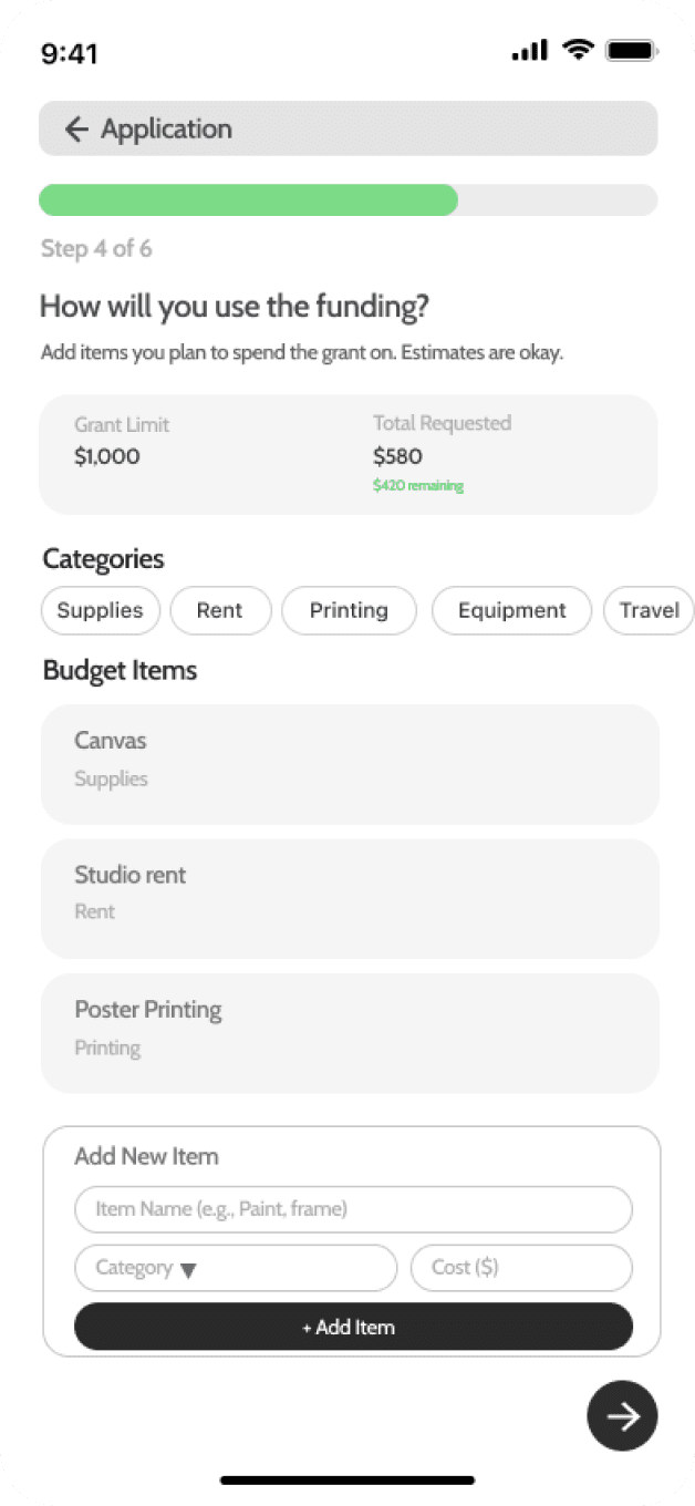 Further Users enter a guided application flow with an Eligibility check, auto-filled profile, Artist Statement, and a Budget Builder. Through the Budget Builder, users can add planned expenses by type while tracking the grant limit and their total requested amount in real time. A Document Upload Checklist lets users reuse saved files