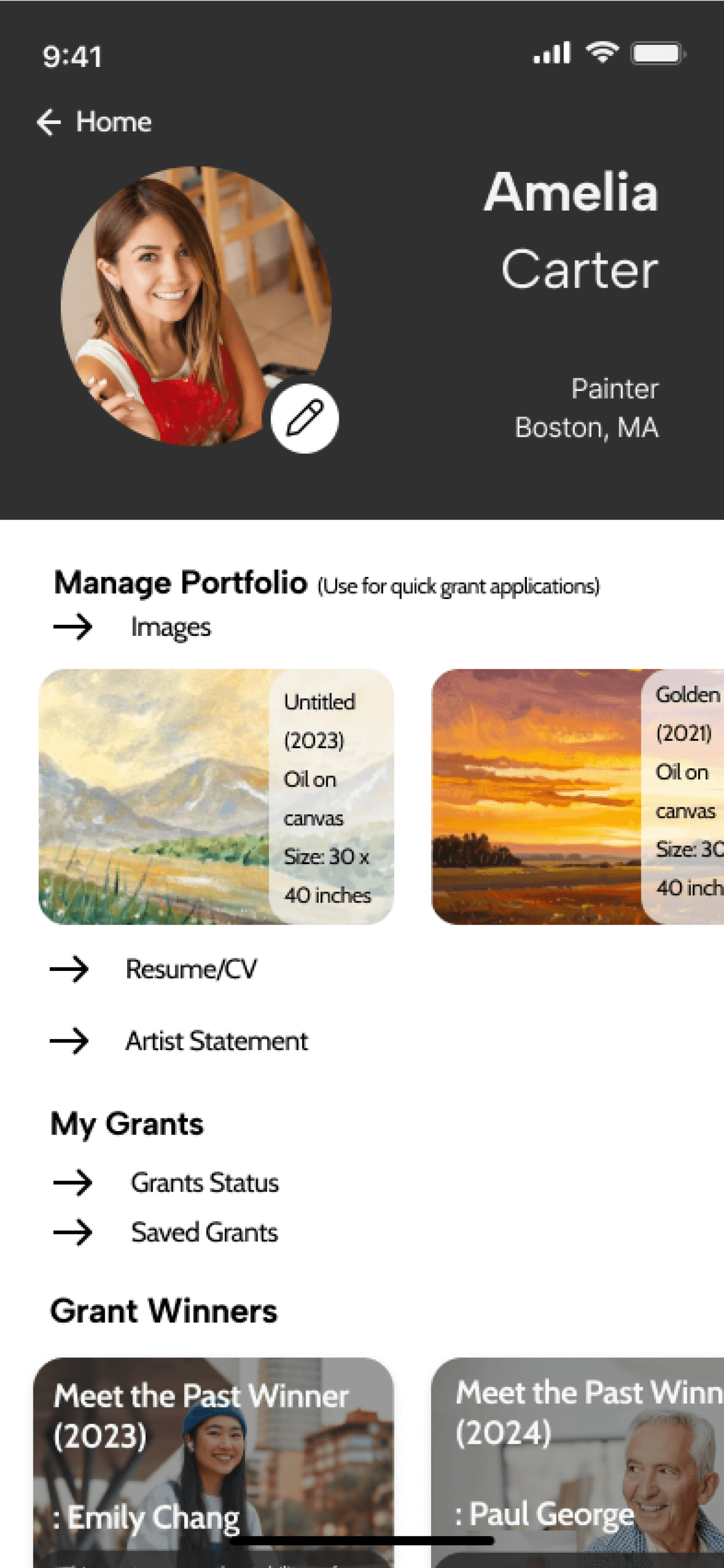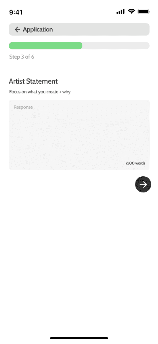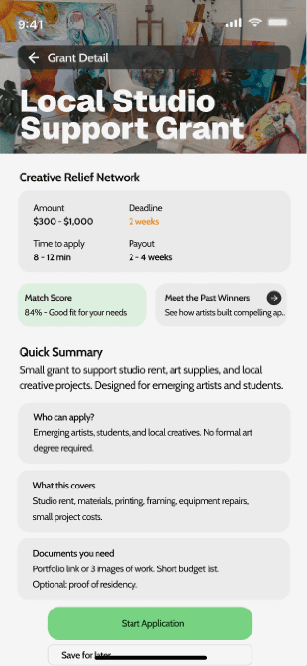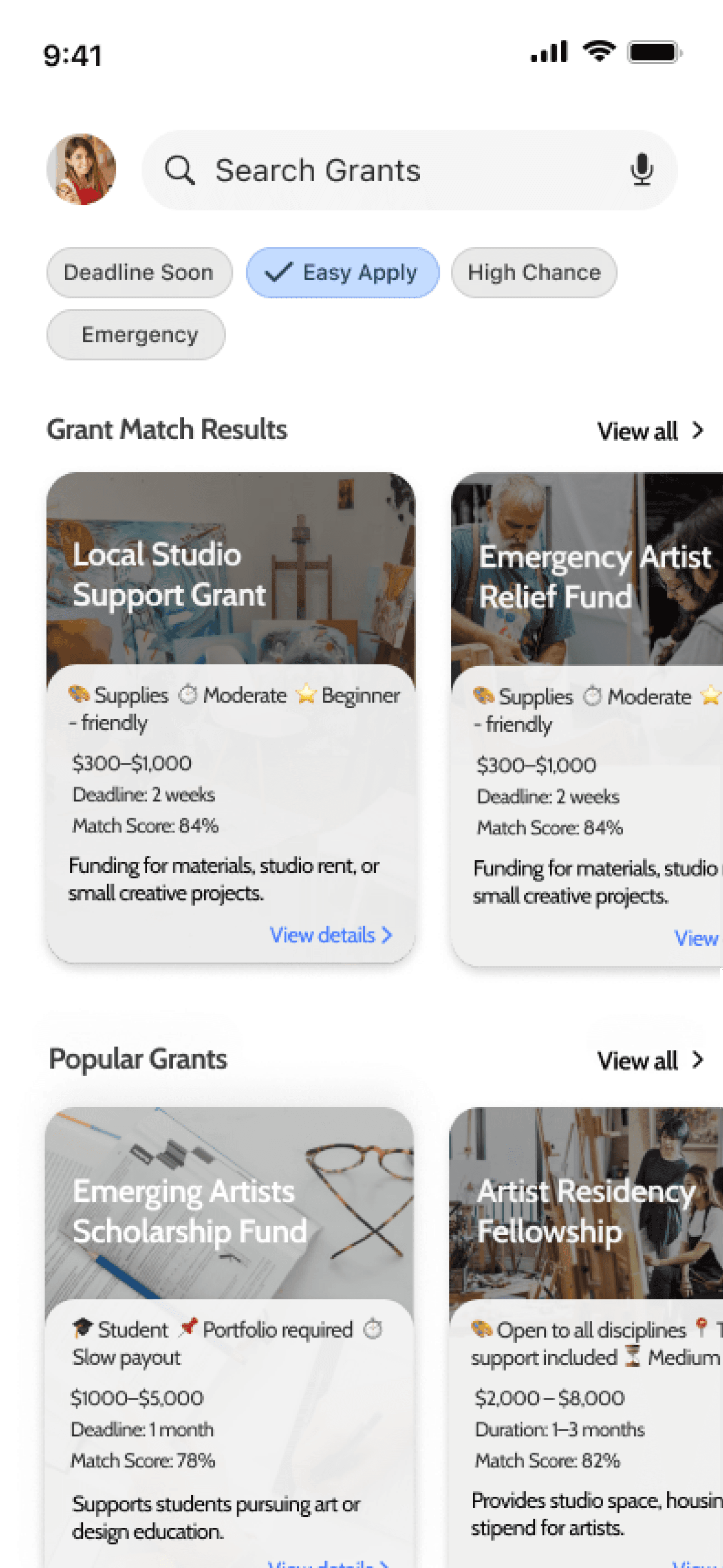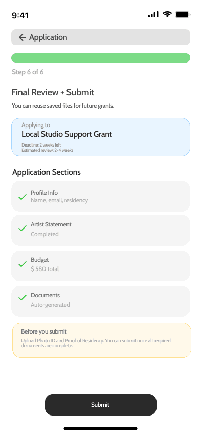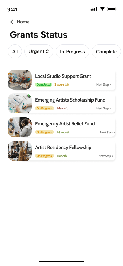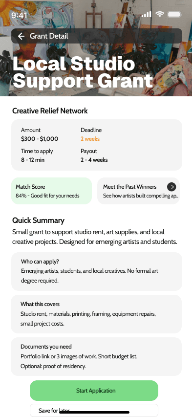 Our home screen was designed to reduce any cognitive overload and center the artist. Instead of overwhelming users with long lists like traditional grant sites, we first surface customized Grant Matches with funding amounts, deadlines, and match scores.