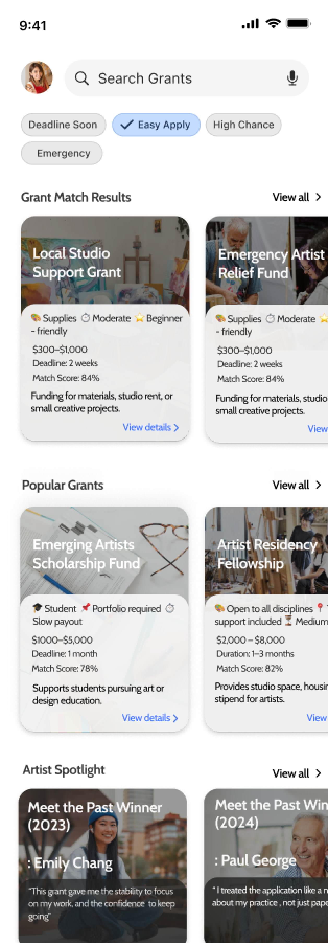 Below, we show Popular Grants to help users discover opportunities they might not have considered or searched for themselves, and Artist Spotlight, “Meet the past winner section” to humanize the process, give motivation, and build trust in the platform.