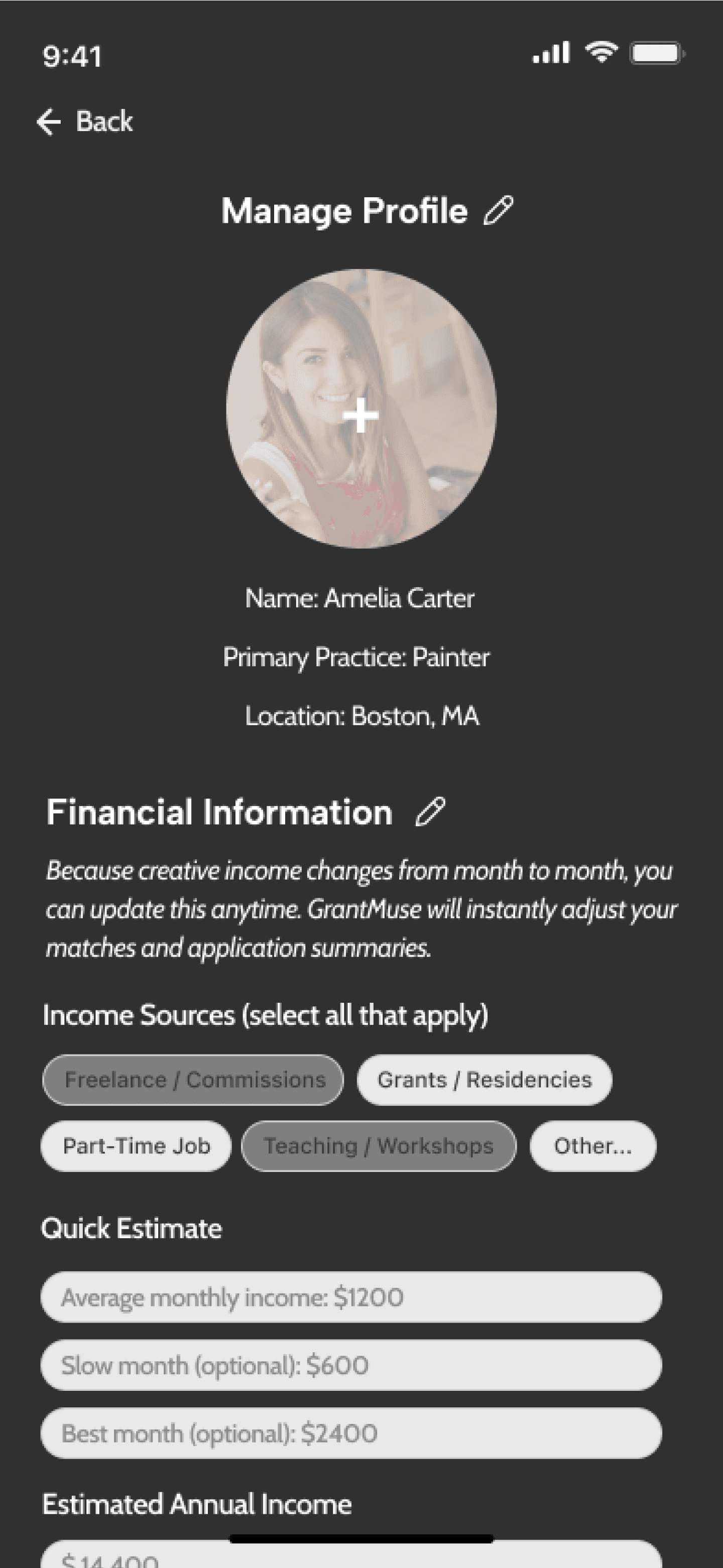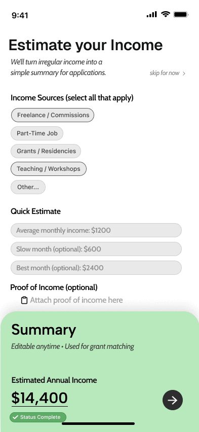 Because creative income changes from month to month, you can update this anytime. GrantMuse will instantly adjust your matches and application summaries.